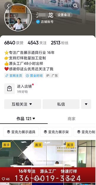 本次合作的短视频客户是一家专注于亚克力定制产品的生产厂家,他们主要生产亚克力展架、易拉宝、广告展示架等产品。